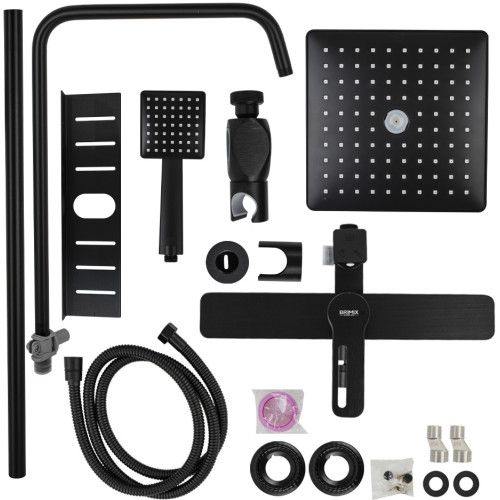 Смеситель + стойка душевая телескопическая "тропический душ" с двумя лейками и двойной полочкой для принадлежностей, в ванную / душевую комнату из авиационного алюминия, черного цвета.